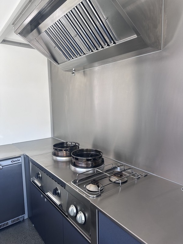 - Professionelle Küche mit zwei Gasherden und zwei Woks
